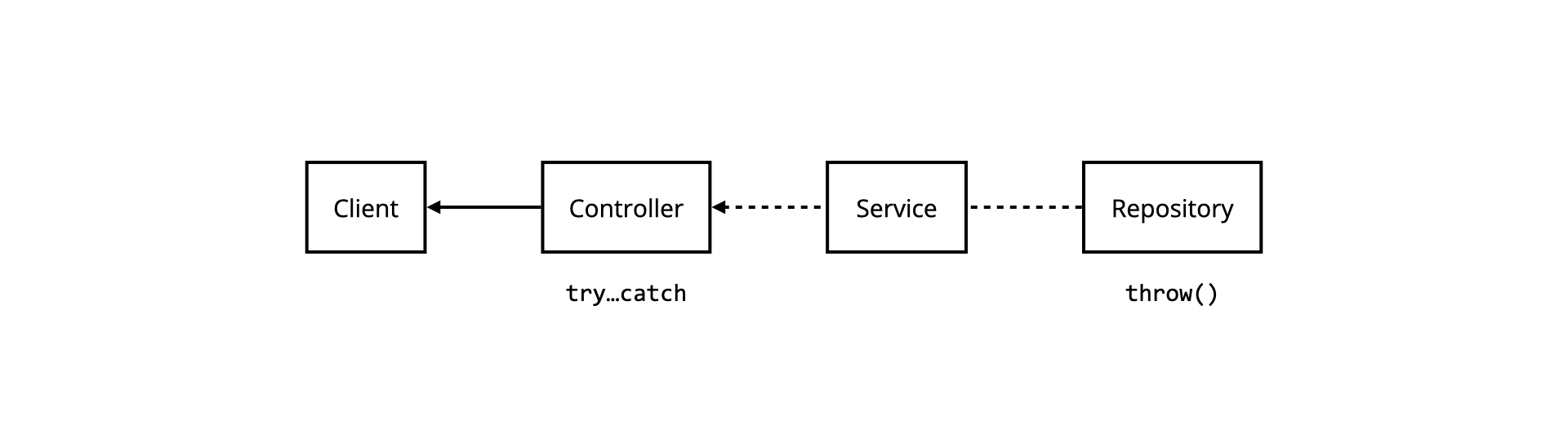 In the second case, when an error is thrown by a repository, it is let through by the calling service — as it doesn't have a try...catch structure—to then be handled by the controller.